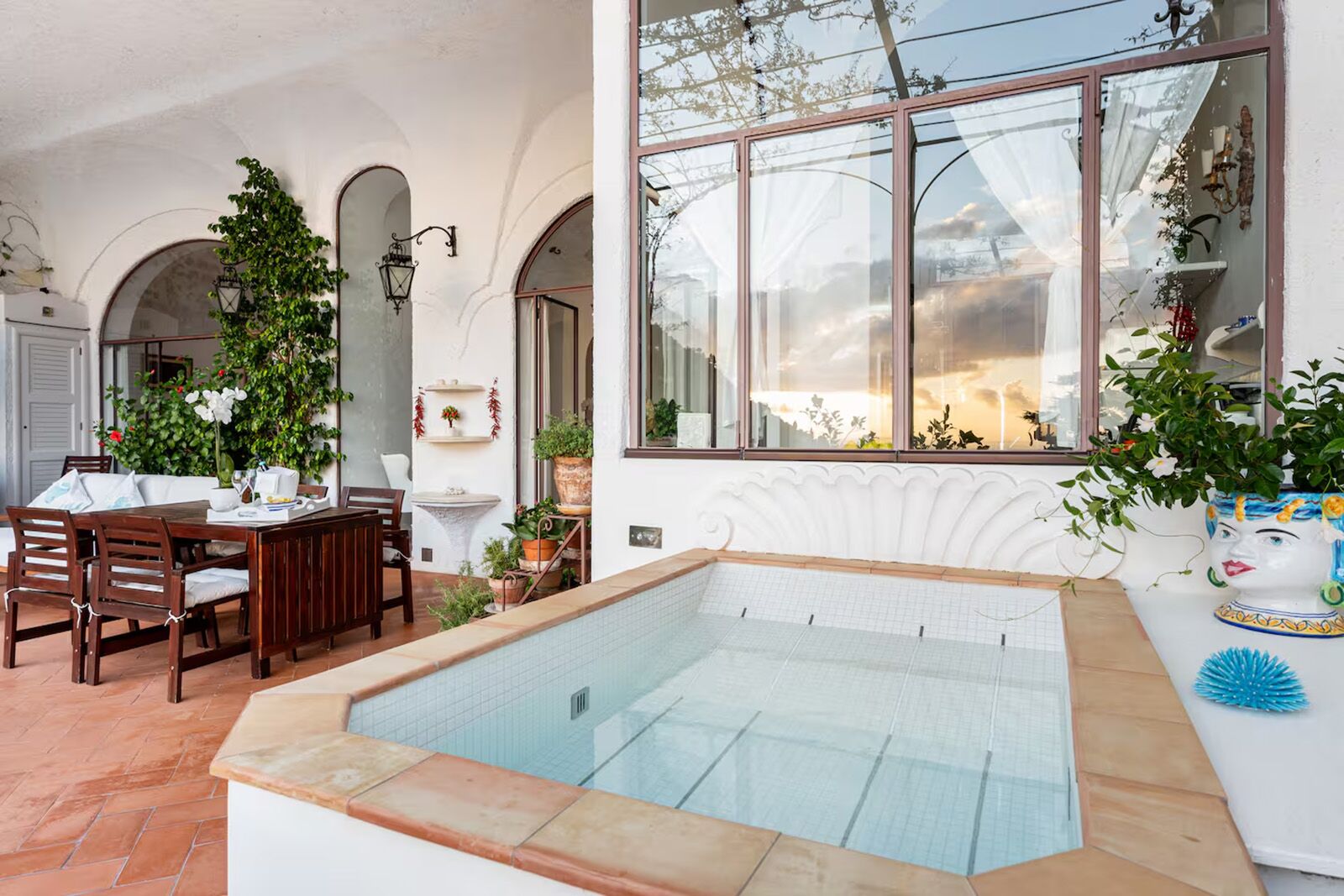See more photos This Amalfi Coast Airbnb with pool is an excellent base for larger groups. The property is split over three levels and partially built within the cliffs. Quirky architectural touches include the bathtub and kitchen with exposed stone. Ample dining areas are handy for family dinners while the piano and chessboard add another layer of entertainment. The garden is rich with foliage while multiple balconies and the pool are perfect for watching those epic Amalfi sunsets.